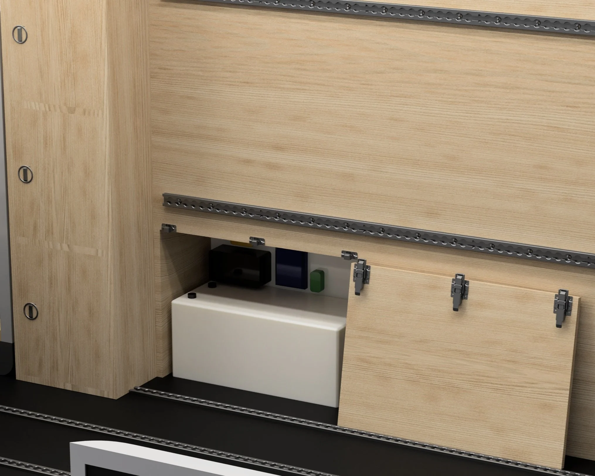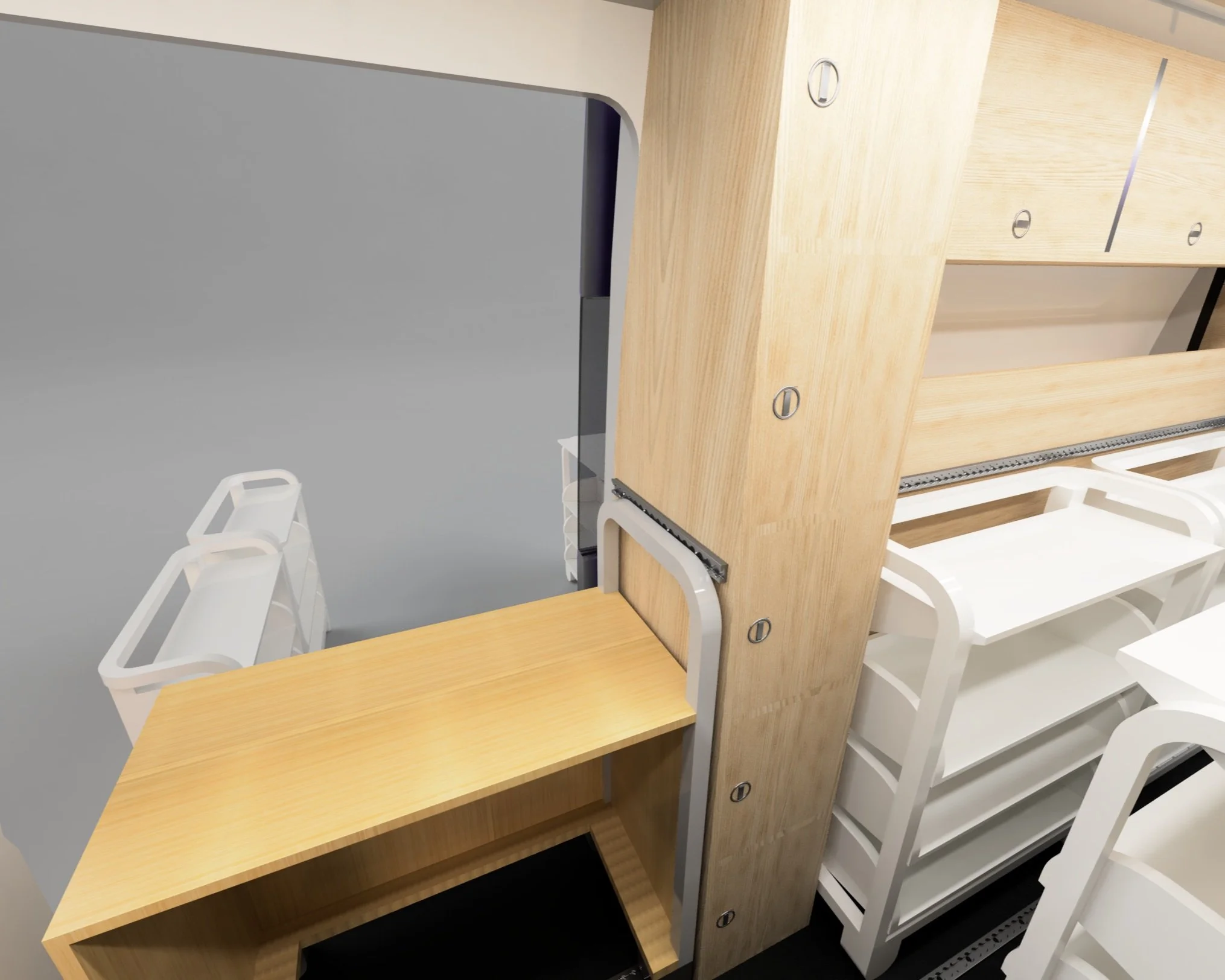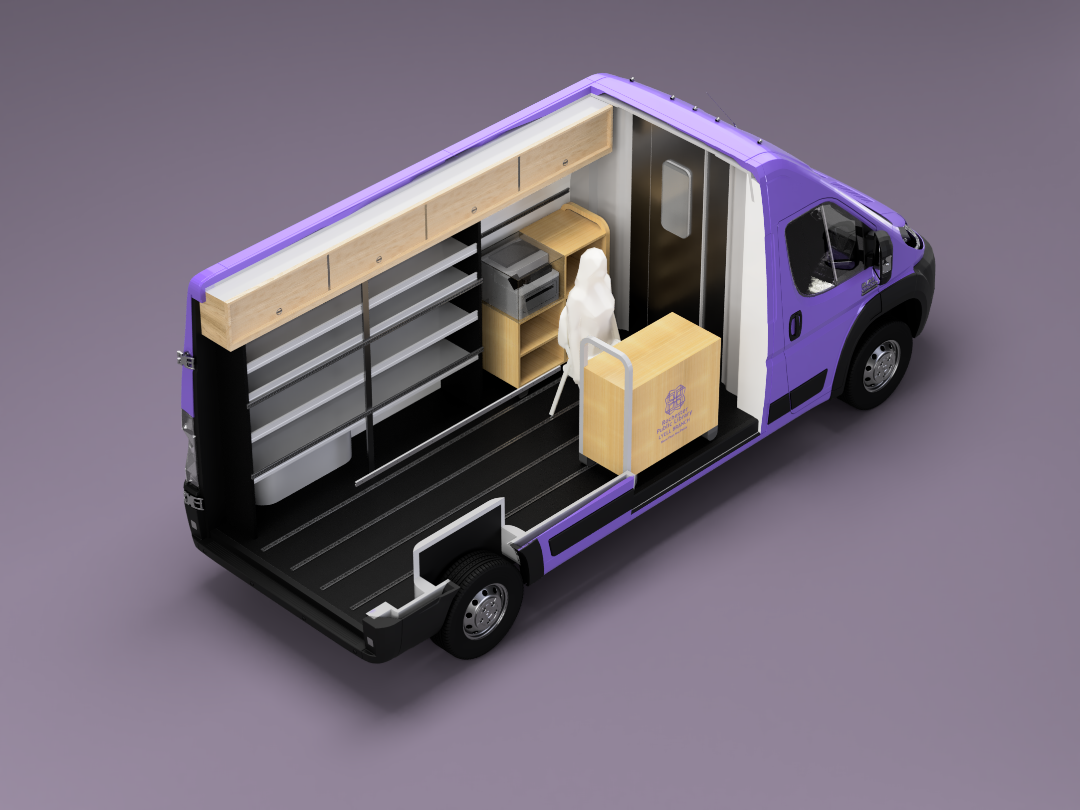 Configuration of carts inside the van allow side door to serve as a service window facilitating indoor/outdoor interactions.